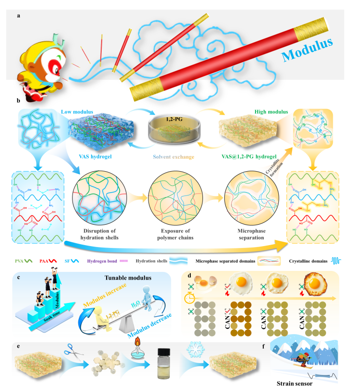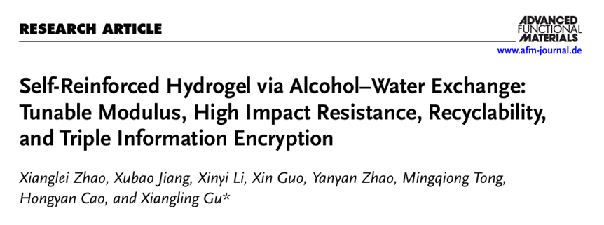 近日,该团队提出了一种“醇析效应”的新思路,通过醇-水置换制备了自增强水凝胶,实现了水凝胶新材料的模量可调、高抗冲、可回收以及三重信息加密。将水凝胶浸泡于1,2-丙二醇(1,2-PG)中,调控浸泡时间实现了模量从kPa至MPa的精准调节。通过溶剂置换诱导聚合物链形成纳米级微晶域和多重氢键网络,有效增强了材料的力学性能。置换后的水凝胶展现出卓越的强韧性与抗冲击性能以及优异的抗冻性。此外,所设计的材料可实现模量的“高-低”循环调控,具有良好的可回收性能,契合绿色材料的设计理念。研究团队使用硝酸铈铵溶液,开发了时间/紫外/温度三重响应的集成防伪新方法,用于动态信息隐藏与“阅后即焚”式加密显示。该工作以我校与济南大学联合培养硕士研究生赵相磊作为第一作者,顾相伶教授为通讯作者,10月27日以“Self-Reinforced Hydrogel via Alcohol-Water Exchange: Tunable Modulus, High Impact Resistance, Recyclability, and Triple Information Encryption”为题在线发表(Xiangling Gu*, et al, Adv. Funct. Mate., 2025, e23269)。