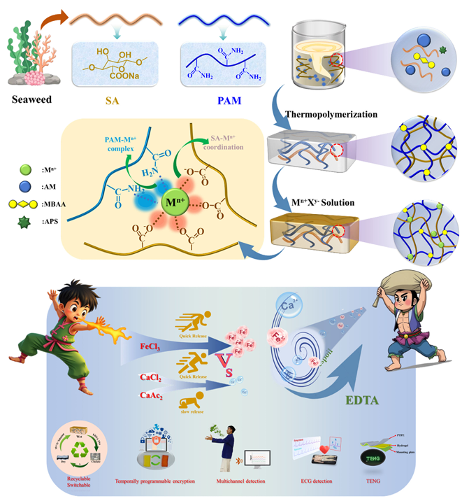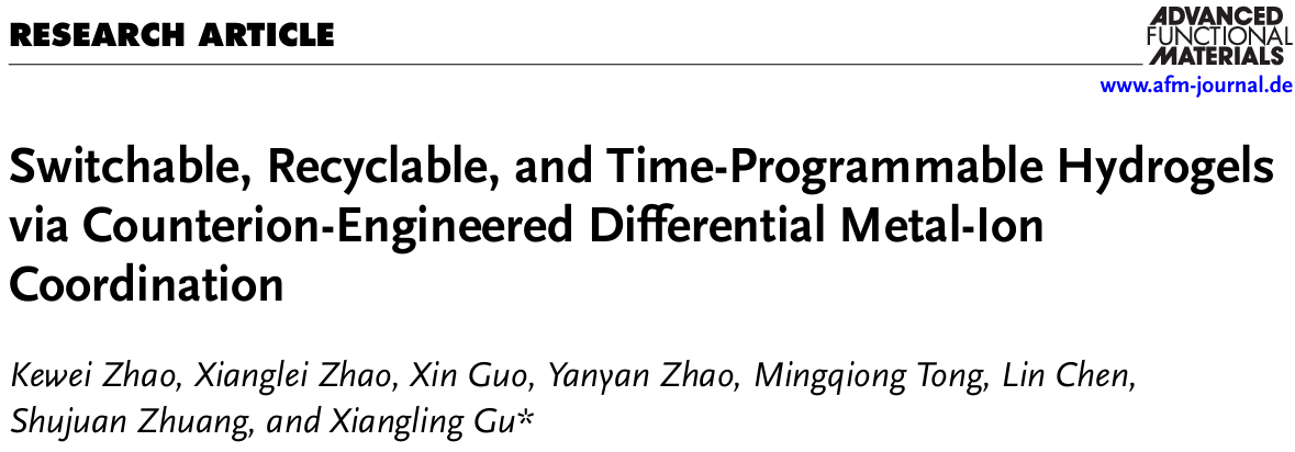 该团队基于抗衡离子调控策略开发出集功能切换、绿色回收与动态加密于一体的多功能水凝胶。首先设计了海藻酸钠-聚丙烯酰胺双网络结构,引入抗衡离子(Cl⁻/Ac⁻)调控金属离子(Fe³⁺/Ca²⁺)的配位行为。研究结果表明,高电荷密度的Fe³⁺可形成强配位网络,而Ca²⁺的配位动力学则显著受抗衡离子影响:Cl⁻促进快速交联形成致密界面,Ac⁻则实现可控释放构建均匀网络。这一发现突破了传统研究仅关注金属离子属性的局限,为水凝胶性能的精准调控提供了新思路。该成果以我校与山东理工大学联合培养硕士研究生赵可伟作为第一作者,顾相伶教授为通讯作者,“Switchable, Recyclable, and Time-Programmable Hydrogels via Counterion-Engineered Differential Metal-Ion Coordination”为题,于8月7日在线发表(Xiangling Gu*, et al, Adv. Funct. Mate., 2025, e14481)。
