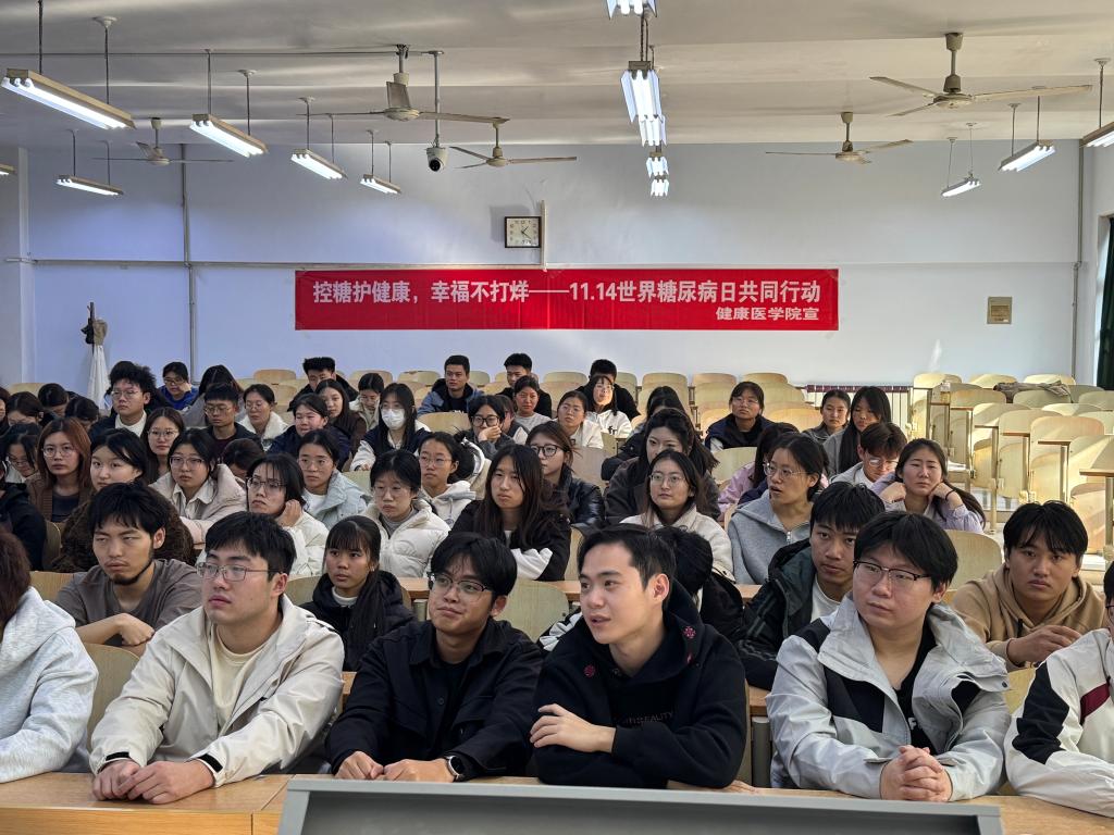 讲座伊始,滕老师从专业角度解析了糖尿病的定义、发病机制及流行趋势。特别强调,近年来糖尿病呈现年轻化趋势,大学生群体因熬夜、缺乏运动、高糖饮食等不良生活习惯,已成为糖尿病的高危人群。通过展示真实的临床案例,讲解了糖尿病视网膜病变、糖尿病肾病等并发症的危害,让同学们深刻认识到科学控糖的重要性。