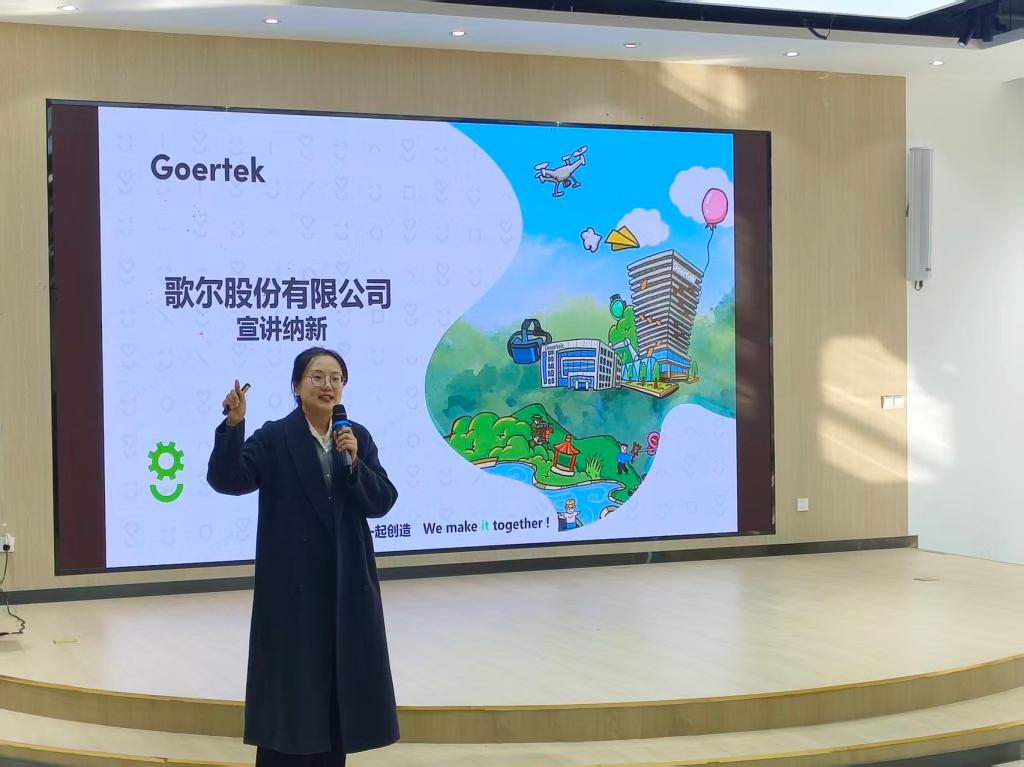 宣讲会伊始,企业宣传片生动展示了歌尔股份的发展历程、业务布局与行业优势。随后,企业负责人系统介绍了公司的核心竞争力和行业发展趋势,为同学们把握就业动态、规划职业路径提供了清晰参考。在岗位介绍环节,企业明确了本次校招计划招聘80人,涵盖技术类岗位50个、管理类岗位30个,并详细说明了薪资福利、入职培训等配套保障,切实增强了毕业生的求职信心。互动环节中,同学们围绕工作地点、晋升通道等关注问题踊跃提问,企业负责人逐一细致解答,部分同学现场扫码投递简历,实现了校企之间的高效对接。此次宣讲不仅打通了信息壁垒,促进了人才与岗位的精准匹配,也为企业注入了新的活力。
